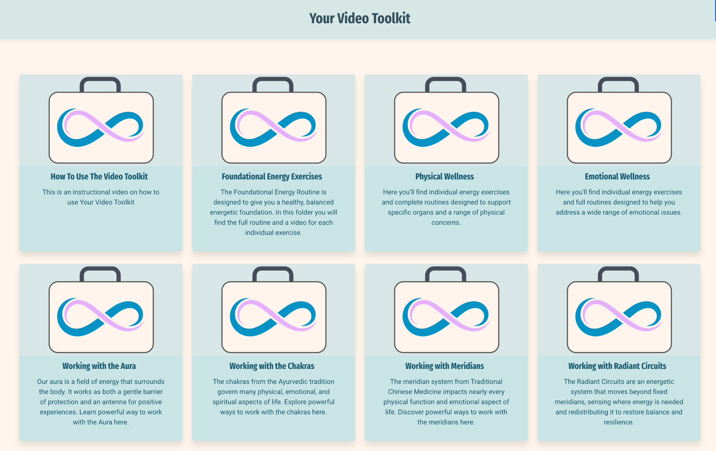 Your Video Toolkit is a structured, searchable library of energy exercises and curated routines designed to help you reset, refocus, and recharge — whether you are supporting your own well-being or integrating energy medicine into client work.